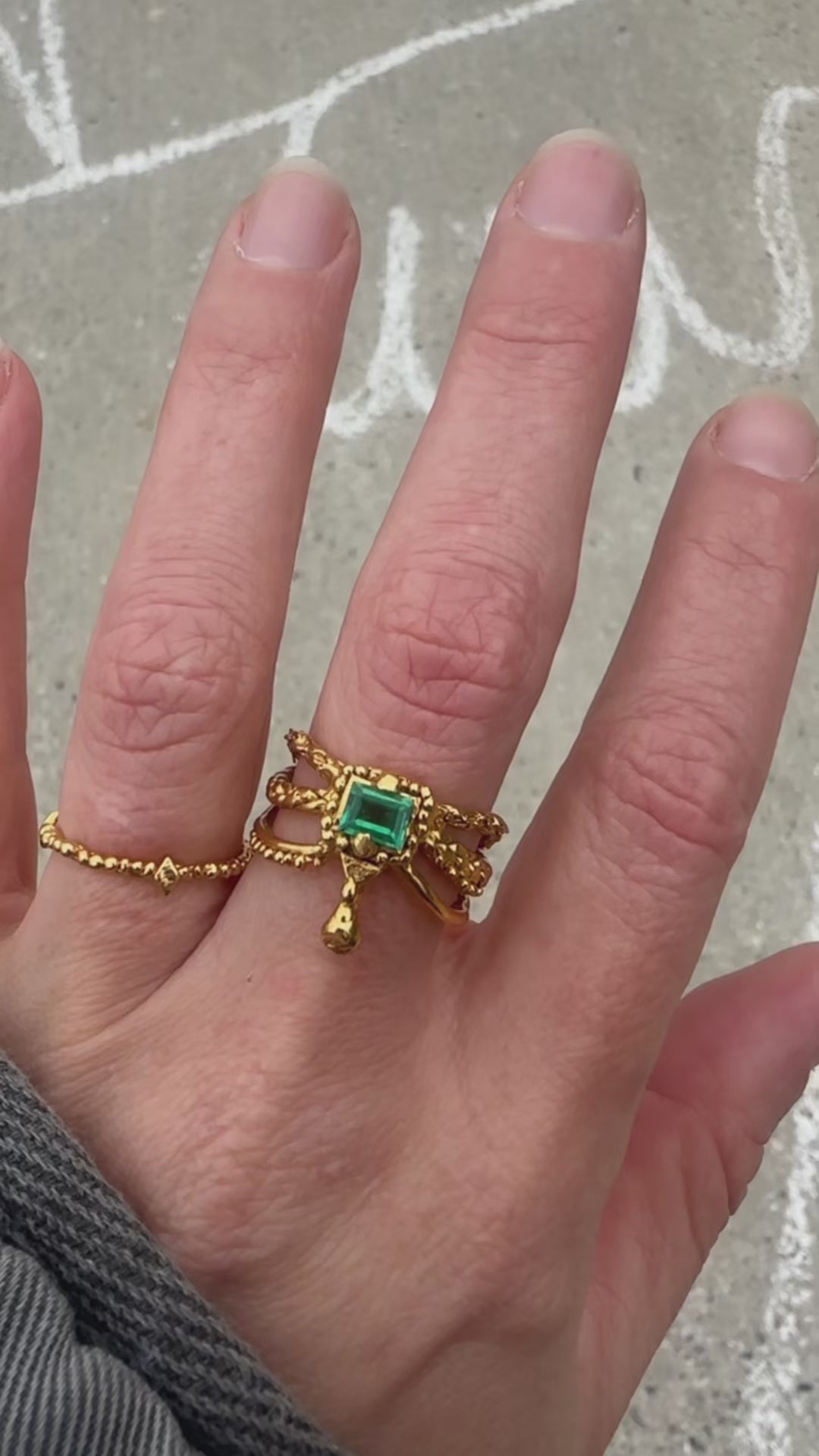 Materials: 24k gold plated brass with a Hydrothermal Synthetic Emerald. We plate all of our rings with 4 microns of gold and use the best of the best for all of our gold plating. This thickness is way above industry standard and means they wear marvellously well.